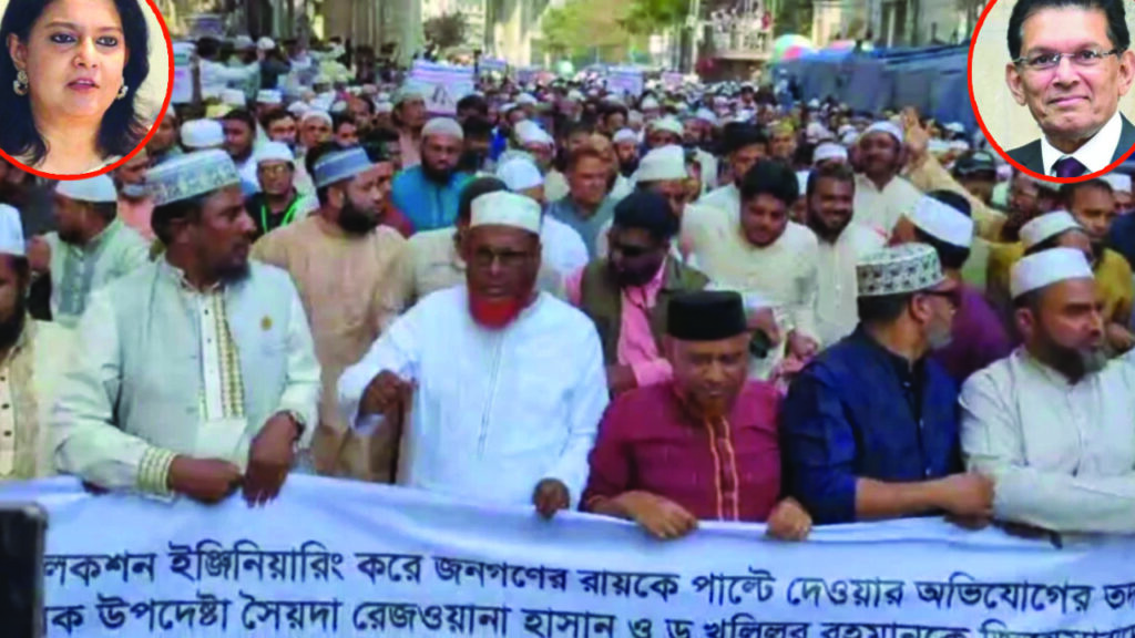 বিক্ষোভ মিছিলে অংশ নেওয়া নেতা-কর্মীরা বিতর্কিত ‘ইলেকশন ইঞ্জিনিয়ারিং’-এর মাধ্যমে জনগণের রায় পাল্টে দেওয়ার চেষ্টার অভিযোগে সৈয়দা রিজওয়ানা হাসান ও ড. খলিলুর রহমানের শাস্তি দাবি করেন।