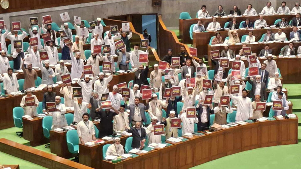 এসময় জামায়াতের নেতৃত্বাধীন বিরোধীদলীয় সংসদ সদস্যরা ‘জুলাইয়ের সঙ্গে বিশ্বাসঘাতকতা বন্ধ কর’ লেখা সম্বলিত প্ল্যাকার্ড প্রদর্শন করেন।