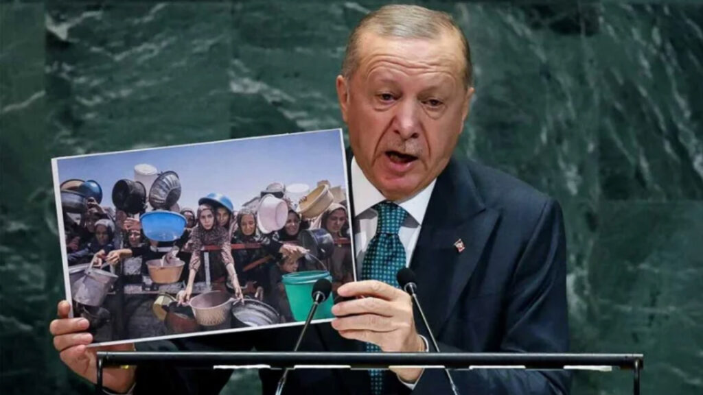 যুক্তরাষ্ট্রের নিউইয়র্কে ‘ফিলিস্তিন প্রশ্নের শান্তিপূর্ণ সমাধান ও দুই-রাষ্ট্র সমাধান বাস্তবায়ন’ বিষয়ক উচ্চপর্যায়ের আন্তর্জাতিক সম্মেলনে ভাষণ দিয়েছেন তুরস্কের প্রেসিডেন্ট রিসেপ তাইয়েপ এরদোয়ান। এ সময় গাজায় ক্ষুধার্তদের একটি ছবি প্রদর্শন করেন তিনি।