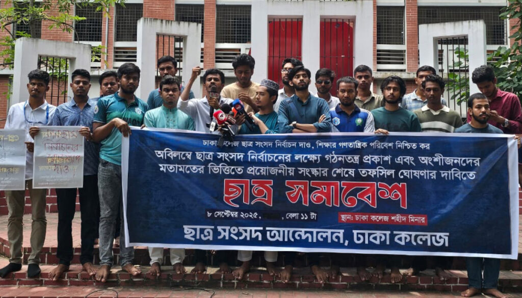 সমাবেশে বৈষম্য বিরোধী ছাত্র আন্দোলনের কেন্দ্রীয় সাংগঠনিক সম্পাদক মইনুল ইসলাম বলেন, ৫২’র ভাষা আন্দোলন, ৭১ এর মুক্তিযুদ্ধ , ৯০ এর গণ অভ্যুত্থান এবং ২৪শের জুলাই আন্দোলনসহ সকল সাংস্কৃতিক এবং রাজনৈতিক আন্দোলনে ঢাকা কলেজের শিক্ষার্থীরা সম্মুখ সারিতে নেতৃত্ব দিয়েছেন। ঢাকা কলেজের ছাত্রসংসদকে বলা হয় থার্ড পার্লামেন্ট। প্রায় তিন দশক ধরে এই প্রতিষ্ঠানের ছাত্রসংসদ নির্বাচন হচ্ছে না। কেন এবং কারা এই নির্বাচনকে বাধাগ্ৰস্ত করছে সেটা আমরা জানতে চাই।