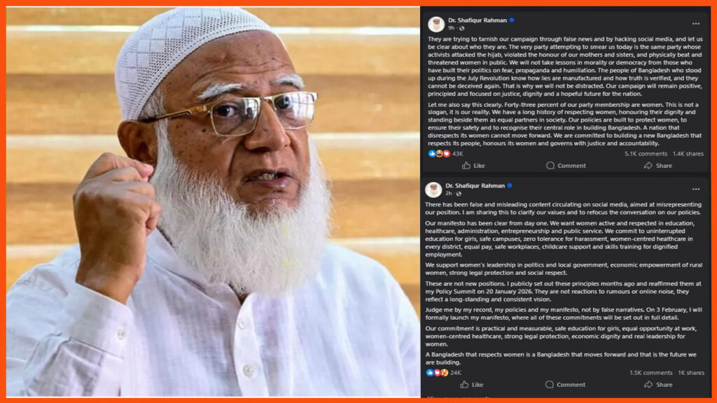 ফেসবুক স্ট্যাটাসে- আমিরে জামায়াত তার বক্তব্যে নাম উল্লেখ না করে রাজনৈতিক প্রতিপক্ষকে আক্রমণ করে বলেন, ‘যারা আজ আমাদের বিরুদ্ধে অপপ্রচারে লিপ্ত, তারাই অতীতে হিজাবের ওপর আঘাত হেনেছে, আমাদের মা-বোনদের সম্মানহানি করেছে এবং প্রকাশ্যে নারীদের শারীরিকভাবে লাঞ্ছিত করেছে। যারা ভয়ভীতি আর অপপ্রচারের রাজনীতি করে, তাদের কাছ থেকে আমরা গণতন্ত্র বা নৈতিকতার পাঠ নেব না।’