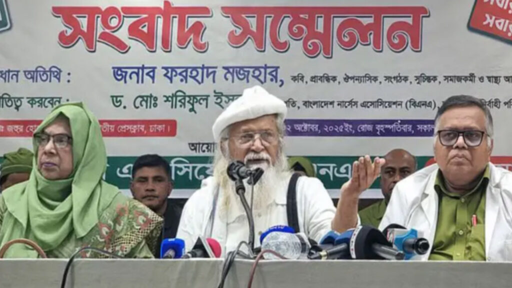 ফরহাদ মজহার বলেন, ‘সরকার বলেছে, সবার জন্য স্বাস্থ্য নিশ্চিত করবেন। ডব্লিউএইচও বলেছে, বিভিন্ন রকমের সরকারের নীতির মধ্যে বলা হয়েছে, সবার জন্য স্বাস্থ্য, সবার জন্য স্বাস্থ্য, সবার জন্য স্বাস্থ্য। হঠাৎ করে আমরা দেখলাম, সবার জন্য স্বাস্থ্য পালিয়ে গেছে। ওকে আর খুঁজে পাওয়া যাচ্ছে না কোথাও।’