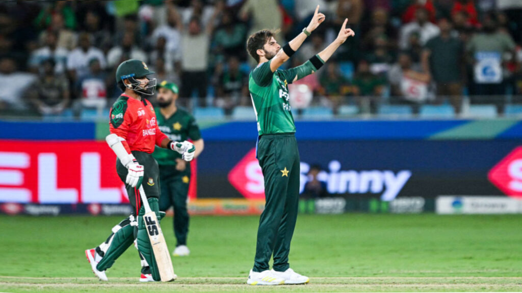 তবে রিশাদের জোড়া আঘাতে ব্যাটিং বিপর্যয়ে পড়ে পাকিস্তান। ২০ বলে ১৩ করে ফখর ও ৭ বলে ৩ রান করে সাজঘরে ফিরে যান হুসেন তালাত। এরপর দলীয় ৪৯ রানে ২৩ বলে ১৯ রান করা অধিনায়ক সালমান আগাকে সাজঘরে ফেরান টাইগার পেসার মোস্তাফিজুর রহমান। সালমানের বিদায়ের পর ক্রিজে আসা শাহীন আফ্রিদি রিশাদ হোসেনের করা ১২তম ওভারে ৩ টা সুযোগ পান। প্রথম বলে এক্সট্রা কাভারে সহজ ক্যাচ নিতে পারেননি নুরুল হাসান।